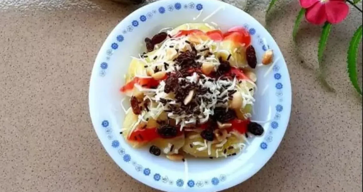- Tambahkan topping kacang tanah, kismis, dan meses. Pisang Kukus Aneka Topping siap disajikan.